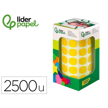 Los Gomets Liderpapel autoadhesivos en forma de círculos amarillos de 15 mm son una solución versátil para diversas aplicaciones escolares y creativas. Este rollo contiene 2500 unidades, proporcionando una amplia cantidad de gomets en un solo empaque, ideal para actividades que requieren gran cantidad de material, como etiquetado, decoración y manualidades. Empaquetados en una caja de cartón, estos gomets garantizan facilidad de almacenamiento y protección.