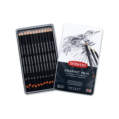 Los lápices de grafito Derwent, presentados en una elegante caja metálica con 12 unidades de durezas surtidas, son una elección ideal para artistas de todos los niveles. Reconocidos por su calidad y versatilidad, estos lápices ofrecen una amplia gama de opciones para diversas técnicas de dibujo y boceto, proporcionando una experiencia de escritura y dibujo suave con una excelente transferencia de grafito al papel.